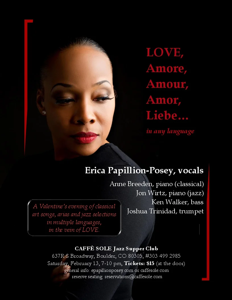 As the title suggests: LOVE... in any language, Erica will be presenting a Valentine's evening of selections not only in the vein of LOVE but LOVE in multiple languages with a classical set in Italian, French, Spanish and German by renowned, nineteenth century romantic composers then rounding out thelover's night with-what else but-beloved jazz gems from some of the twentieth century's best!